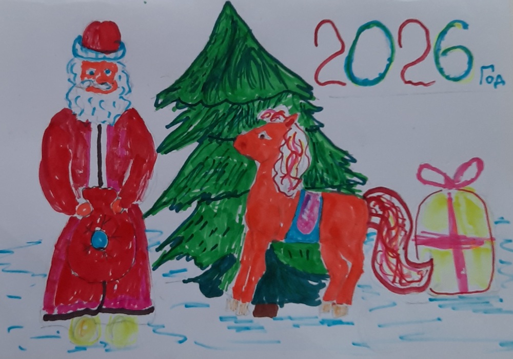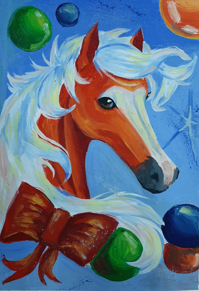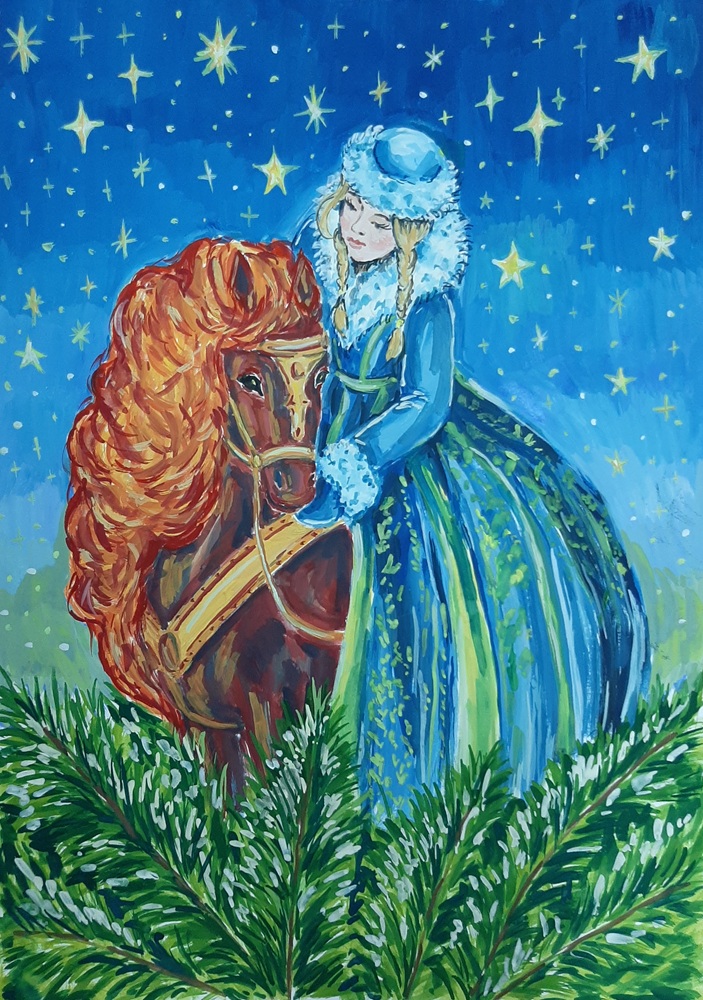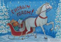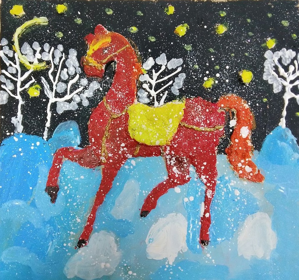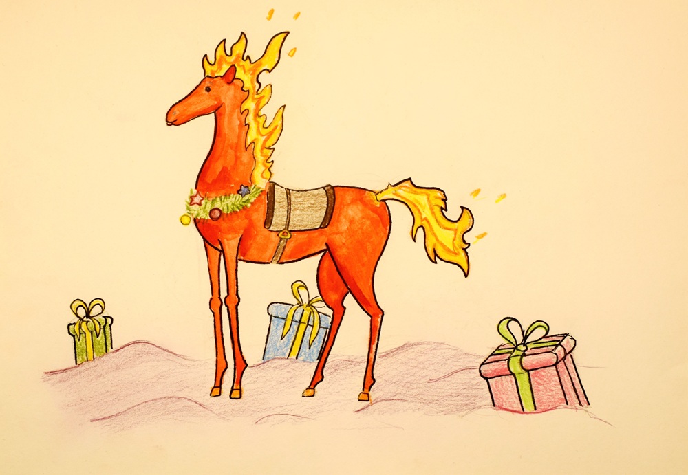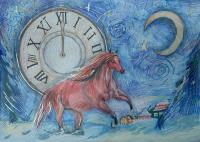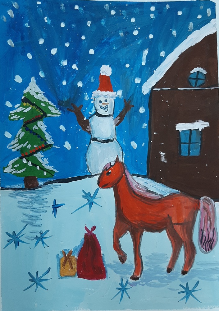 Лаврентьев Роман, 11 лет, МБОУ Гимназия «Планета Детства», город Рубцовск, Алтайский край, учитель изобразительного искусства: Колычева Анжелика Олеговна Под Новый год гордо ходит по заснеженным полям лошадь с прекрасным именем Огненное чудо. Ребята сразу узнают место, где прошлось это удивительное животное. Снег там становится фиолетовым, а между сугробов лежат подарки для мальчиков и девочек!