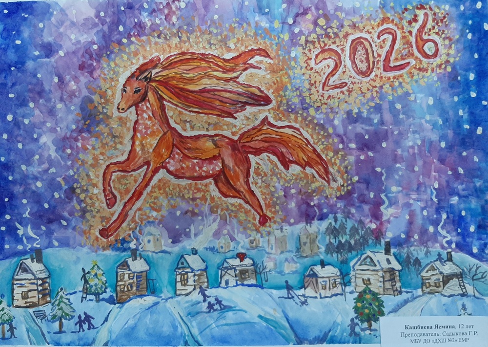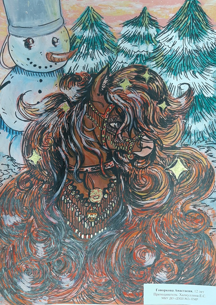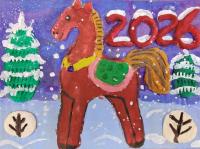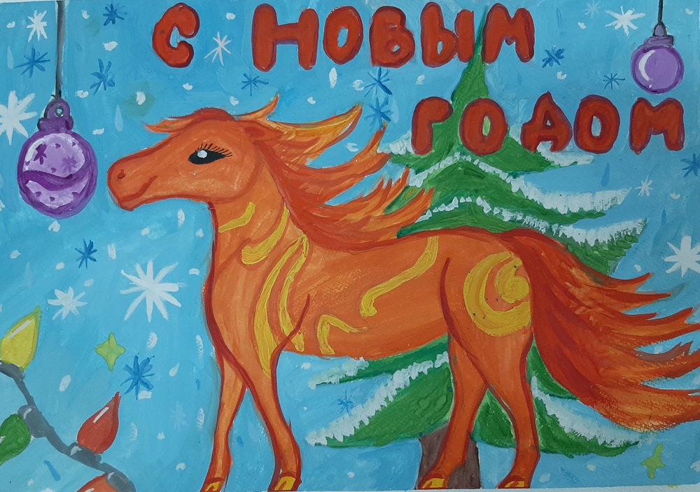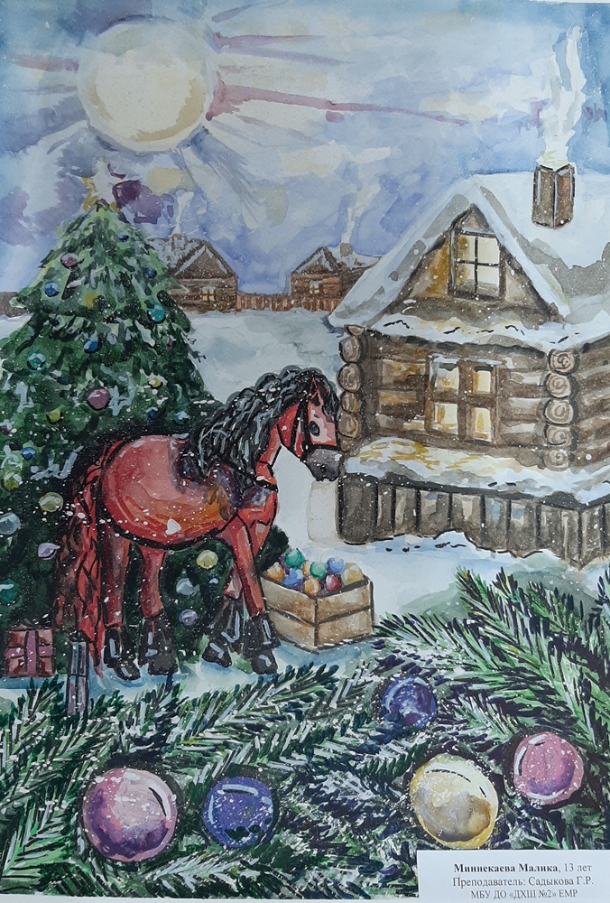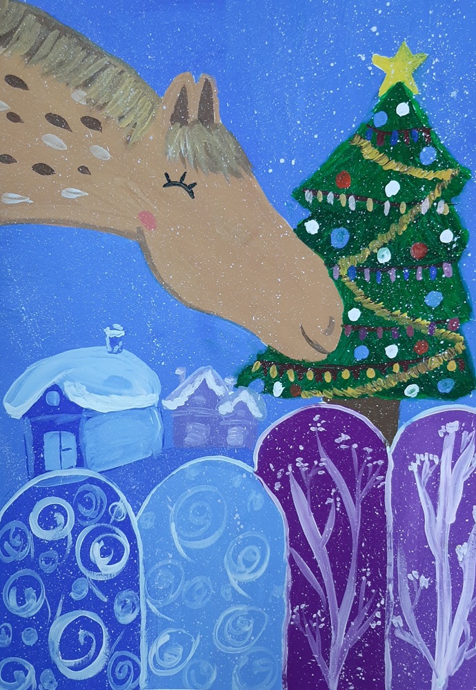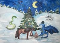 Лаврентьев Роман, 11 лет, МБОУ Гимназия «Планета Детства», город Рубцовск, Алтайский край, учитель изобразительного искусства: Колычева Анжелика Олеговна Под Новый год гордо ходит по заснеженным полям лошадь с прекрасным именем Огненное чудо. Ребята сразу узнают место, где прошлось это удивительное животное. Снег там становится фиолетовым, а между сугробов лежат подарки для мальчиков и девочек!