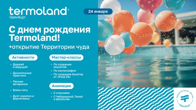 24 января 2026 года сеть городских курортов Termoland отмечает важную дату — первому комплексу Termoland в Оренбурге исполняется один год. За это время пространство стало точкой притяжения для семейного отдыха, восстановления и качественного досуга. В день рождения комплекса гостей ждет ключевое событие — официальное открытие новой постоянной локации «Территория чуда», которая расширит концепцию курорта и добавит в нее элемент осознанного отдыха и психологического опыта.
